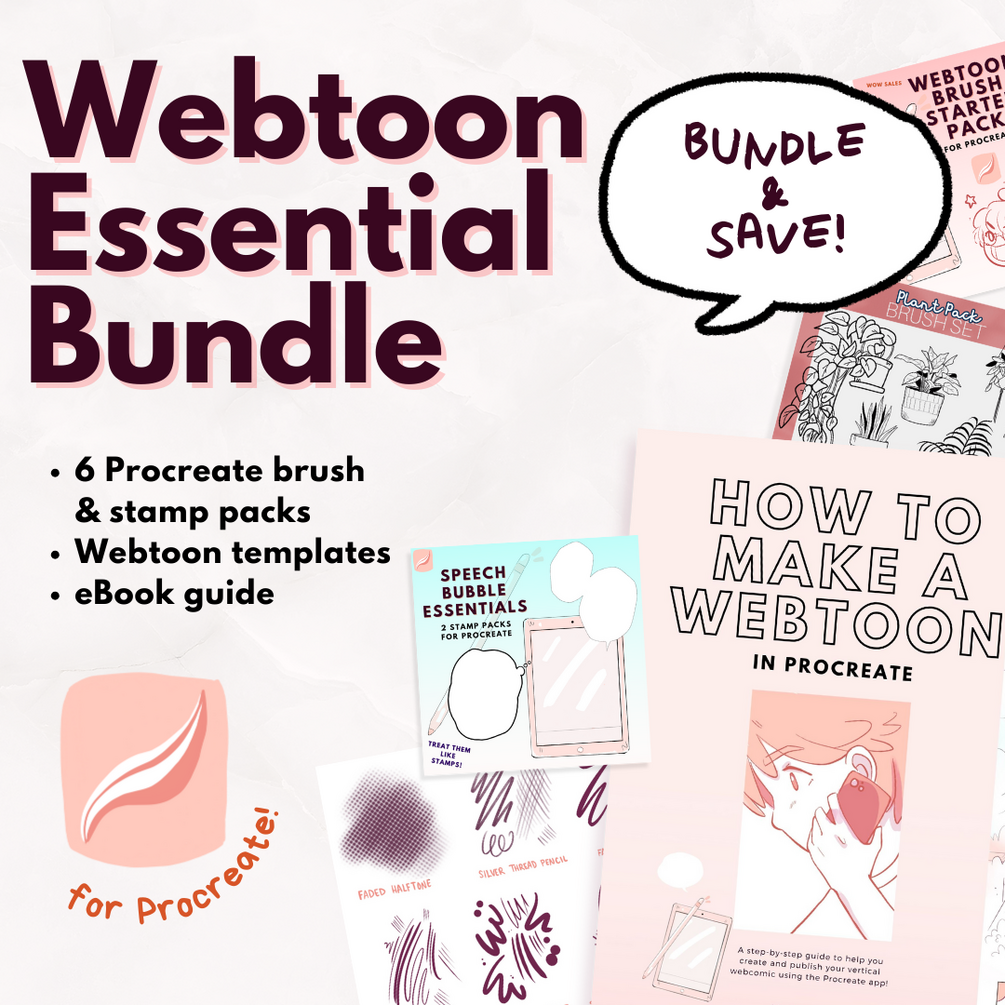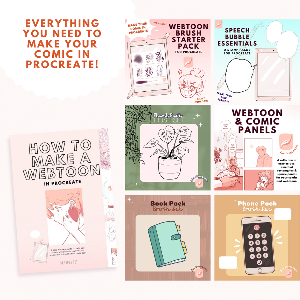 HOW TO MAKE A WEBTOON IN PROCREATE eBook | Webtoon Essentials Brush Pack (7 brushes) | Plant Pack (8 stamp brushes) | Book Pack (13 stamp brushes) | Phone Pack (16 stamp brushes + 1 PNG) | Comic Panels Pack (8 stamp brushes) | Speech Bubble Essentials Pack (22 bubbles) | Full Episode Template | Single Column Template